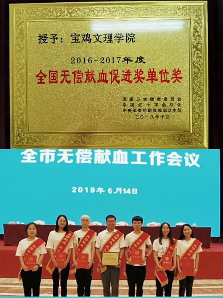 无偿献血是一项崇高的社会公益事业,也是青年大学生践行社会主义核心价值观、履行社会责任的行为体现。近年来,我院先后有14人获得全国无偿献血志愿服务奖,太阳成集团tyc122cc入口多次获得宝鸡市无偿献血先进单位荣誉。