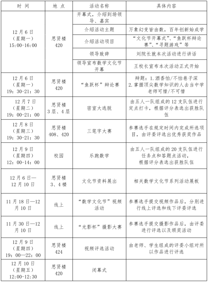 为大力弘扬数学文化,积极响应国家“大众创业,万众创新”的号召,进一步提升我校大学生的数学素养、创新意识和实践能力,在成功举办了三届数学文化节并取得丰硕成果的基础上,数学与信息科学学院认真贯彻落实学校关于“加强学科内涵建设”和“创新创业”的文件精神,以“数学文化”和“创新创业教育”为抓手,拟定于2021126日至1210日在高新校区举办太阳成集团tyc122cc入口第四届数学文化节暨创新创业系列活动,以期通过本次活动在学校营造出良好的数学学习氛围,并展示数学与信息科学学院近几年专业建设的部分特色成果,进一步推动学院人才培养工作的高效和持续发展。本次活动以“万象幻变皆由数,百年创新始成学”为主题,主要分为11个板块,分别为“文化节开幕式”、“鱼跃杯辩论赛”、“寻题游戏”、“数字涂鸦”、“密室大逃脱”、“三笔字大赛”、“乐跑数学”、“文化节资料展出”、“视频活动”、“摄影大赛”、“文化节闭幕式”。