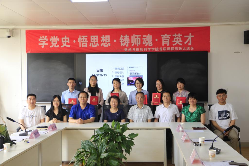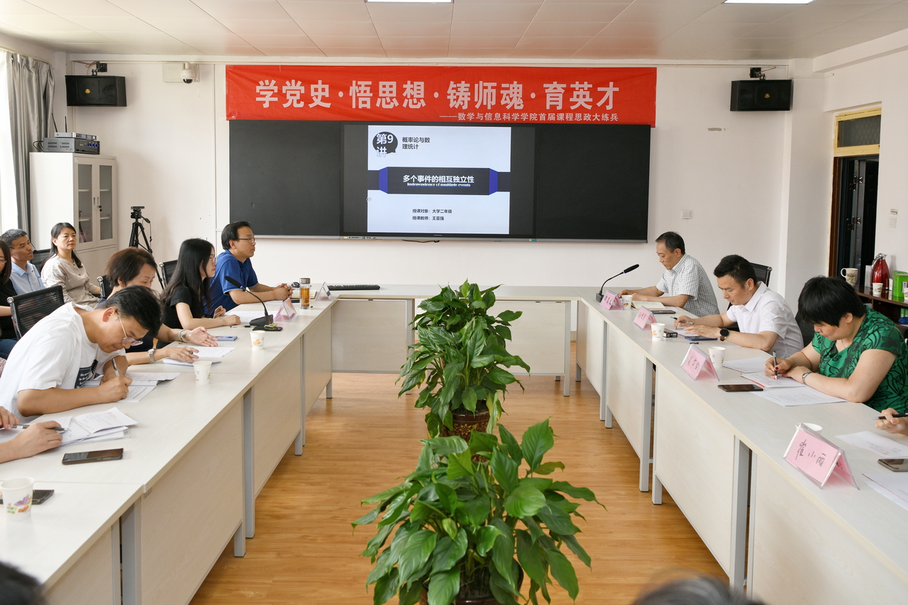 为深入贯彻落实习近平总书记在党史学习教育动员大会上的重要讲话精神,用习近平新时代中国特色社会主义思想铸魂育人,高质量做好新时代学校课程思政建设,2021526日,数学与信息科学学院在思贤楼424会议室举办了“学党史、悟思想、铸师魂、育英才”系列活动一:首届课程思政大练兵讲课竞赛。比赛由数学与信息科学学院副院长杜红珍主持。