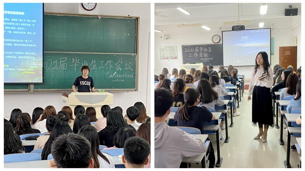 5月14日下午,我院分别在思贤楼420、408、426教室召开数学与应用数学专业、信息与计算科学专业、统计学专业2021届毕业生工作会议。数学与信息科学学院党委副书记王欢、副院长杜红珍、辅导员张文婧、王耀兰、班主任王向锋、毕业生实习指导老师邢星、2014级优秀毕业生张玉洁及2017级全体毕业生参加了会议。