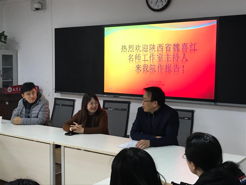20191218日下午16:30,宝鸡中学魏喜红老师在思贤楼424教室为我院研究生做了一场精彩的学术报告会。本次报告会由数学与信息科学学院孙小军教授主持,院长刘淳安教授致辞,2019级教育硕士学科教学(数学)专业全体研究生参加了此次报告会。