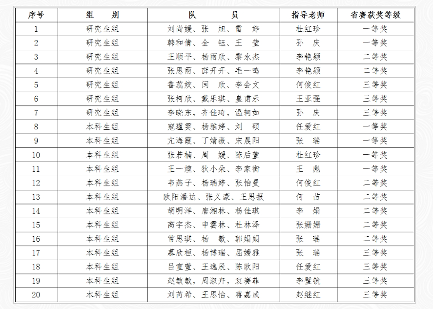 全国大学生统计建模大赛由中国统计教育学会主办,是《全国普通高校大学生竞赛排行榜》内的重要赛事之一。在教务处、研究生院的支持下,数学与信息科学学院选派具有丰富经验的教师组建指导团队,对参赛学生给予论文选题和论文写作等赛事指导。最终参赛团队以新颖的作品选题、科学的统计方法、严谨的内容设计取得了良好的比赛成绩。(教务处、研究生院、数学与信息科学 文/王亚强 审核/周喜华、王肖烨、刘淳安)
