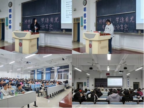 活动现场座无虚席,学生们激情澎湃,期待着两位优秀学生代表的到来。郭欢从整理笔记、课后巩固、备考策略等多个方面向大家阐述自己的经验和心得,并且鼓励大家积极参加学科竞赛。张利欣则是从学习动力、课后练习、抓住时代机遇向大家讲述了学习的方法和方向,同时鼓励大家在实践中提升自我。在本次分享会中,她们将自己的学习经验倾囊相授,交流结束后,同学们以热烈的掌声感谢两位学生的分享。